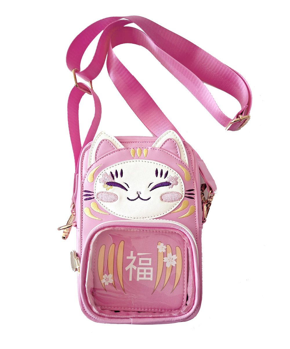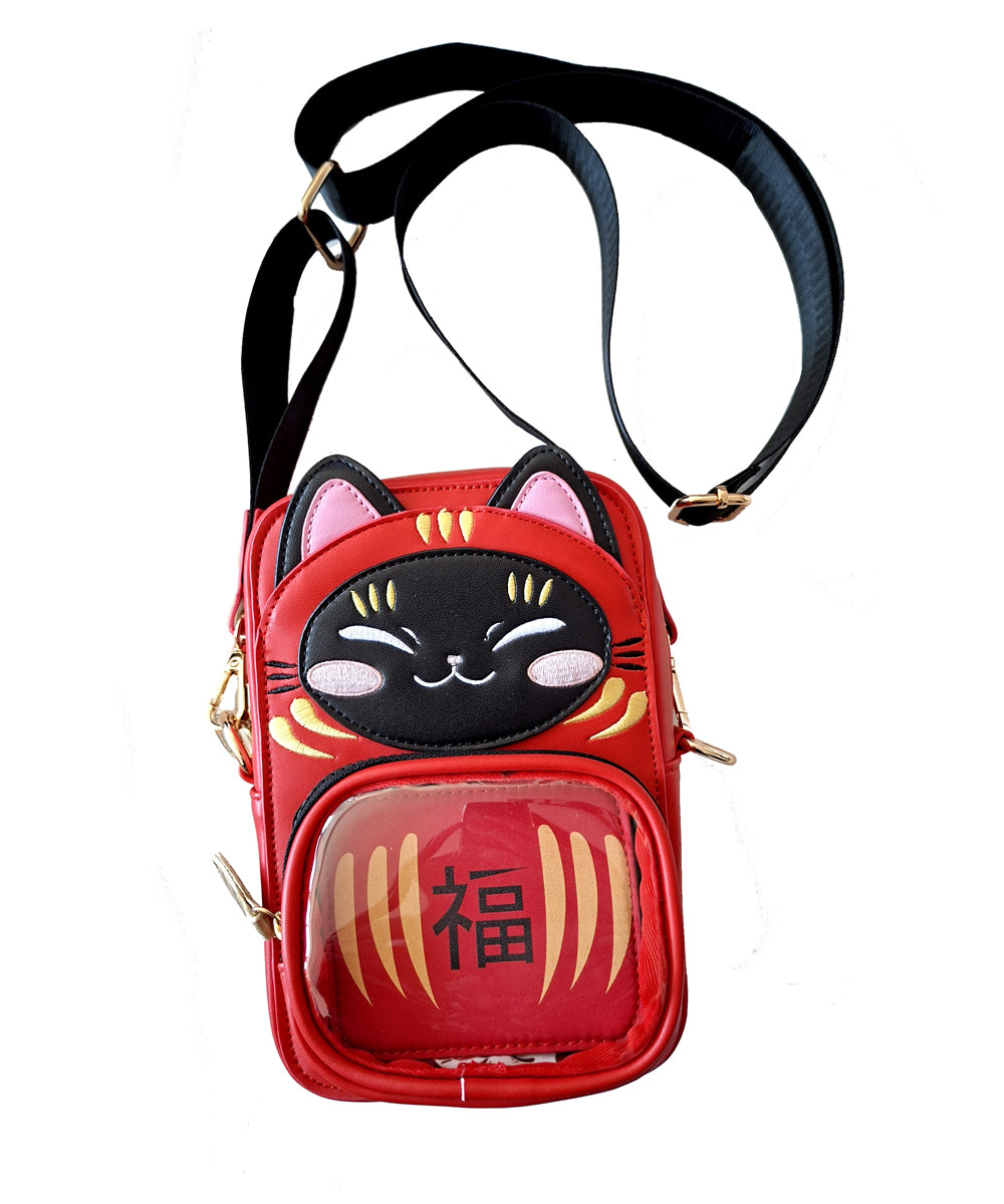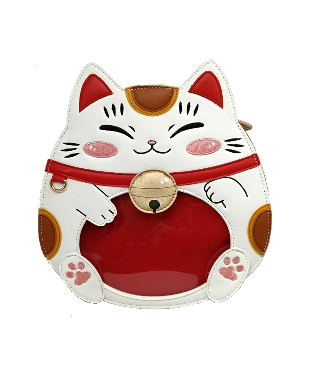 The straps are made of polyester, there are 3 of them, so you can wear it as a backpack or as a bag. The cat details, such as the eyes, mouth, etc. are embroidered .They have an external pocket on the back and several compartments inside. The front section can be opened to place the pins of your choice, although it can also be used as it is. The zipper pulls are decorated with Maneki Neko coin details.